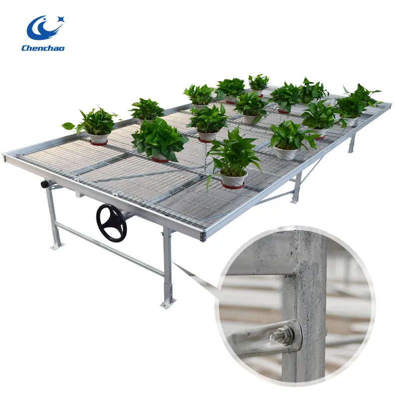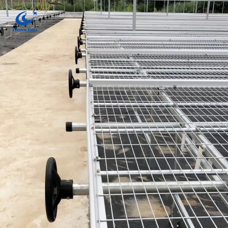 Electric welding net mobile Seedbed is a modern planting equipment mainly used in places such as flower production and vegetable seedling Greenhouses. Its structure is mainly assembled from seedbed mesh, aluminum alloy frame, Roller tube, cross brace, bracket, handwheel, adjusting base, etc.
